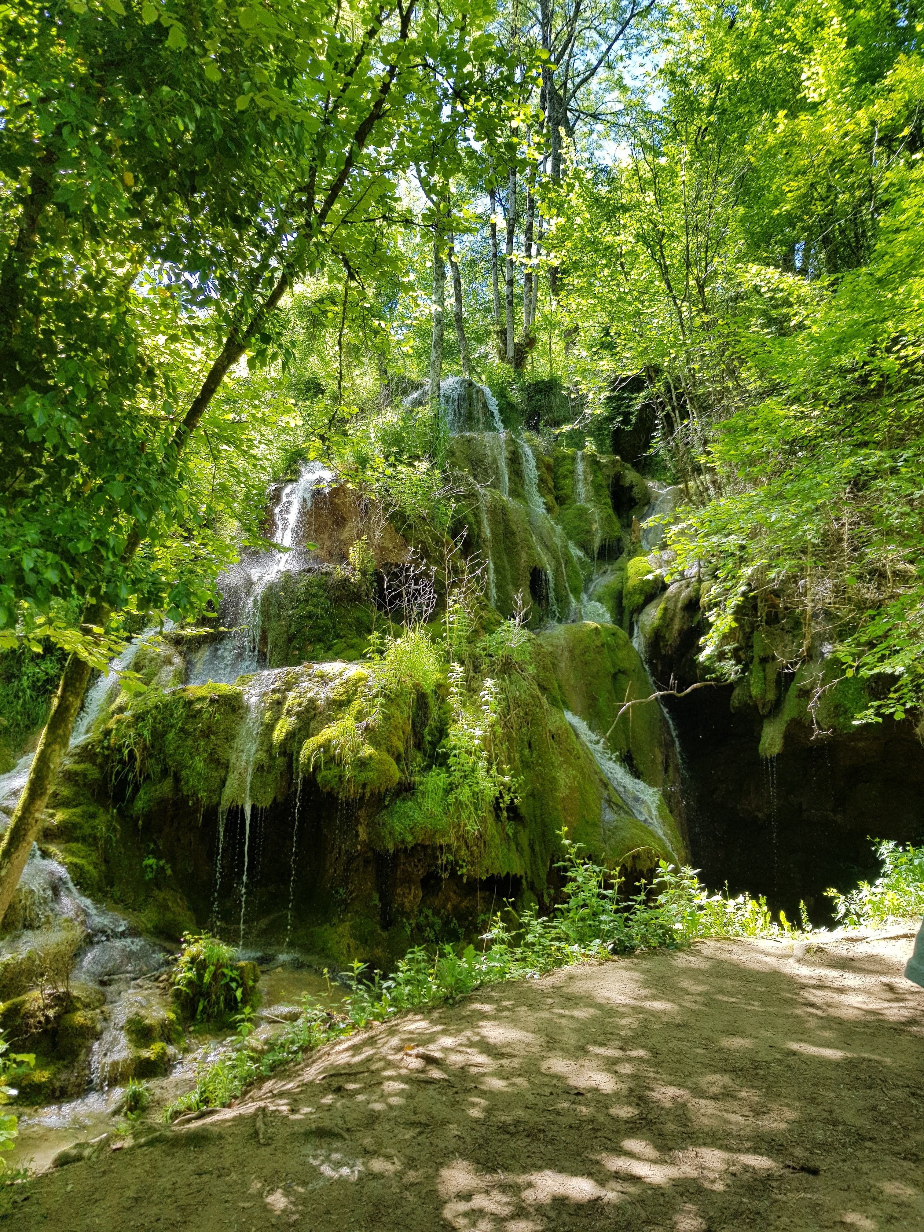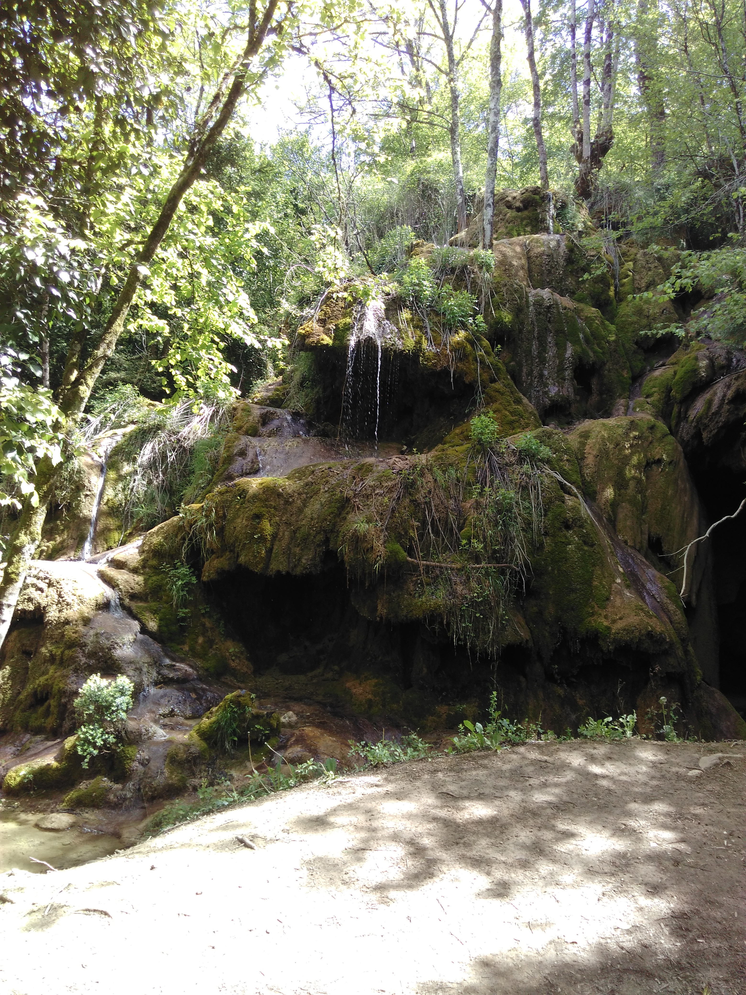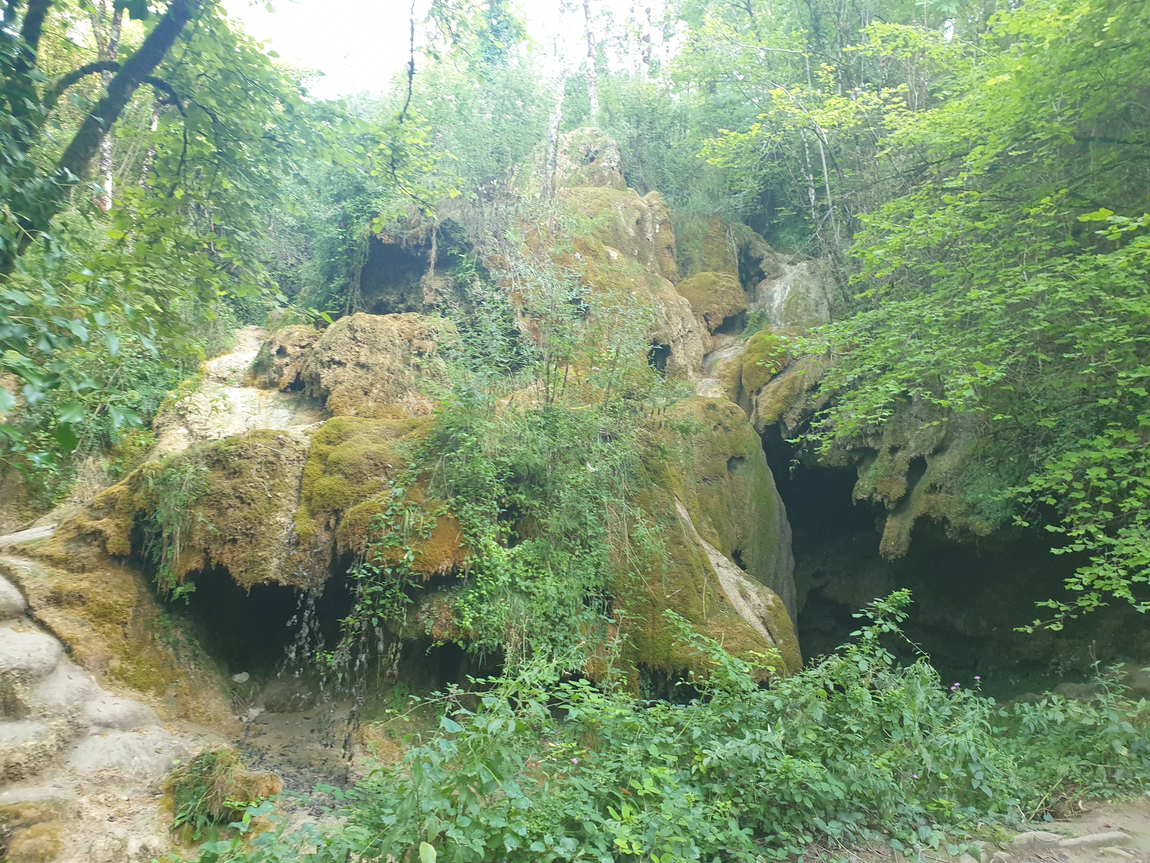 Lieu étrange et mystérieux pour qui visite en été car, si la cascade est sèche , le tuf créé par les chutes d'eau sont là et bien visibles. Les multiples grottes, le sous bois dense, le réseau de chemins qui pénètrent dans la profondeur de la forêt, l'appel de la hauteur pour atteindre le sommet ... Les fées attendent dans le sous-bois et les trolls dans les grottes. De belles terrasses avec table et guinguette disponibles pour les moins courageux, ombre garantie.